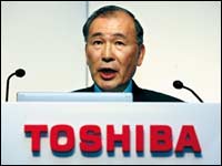 رئيس الشركة اليابانية العملاقة للإلكترونيات توشيبا السيد اتسوتوشي نيشيدا أثناء إدلائه بخطاب افتتاحي في المؤتمر الصحفي الذي أقامته الشركة بالعاصمة اليابانية طوكيو. وكان ........