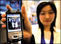 عارضة صينية تستعرض أمام كاميرات المصورين آخر منتجات شركة سامسونج الكورية الجنوبية، والمتخصصة في مجال الصناعات الإلكترونية، من هواتف النقال المزودة بمشغل لملفات الفيديو. ويتميز ........