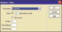 3- تظهر الشاشة التالية لاختيار الاستعلام المطلوب عرض سجلاته وبه اختيار عرض 10 سجلات فقط وعرض حد الجدول وتباعد الخلايا بينها وبين بعضها وبينها وبين البيانات.
