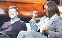يظهر مالك شركةمايكروسوفت العملاقة بيل جيتس وبجانبه الممثلة السمراء المشهورة كوين لطيفةأثناء حضور مؤتمر الترفيه التكنولوجي في قاعة اجتماعات شرين بلوس انجليس في ........