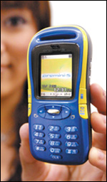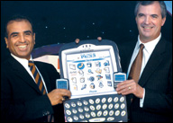 يظهر في الصورة رئيس شركة بهارتي تيلي فينتورز السيد سيونيل بهارتي ميتال(يسار ) والمدير التنفيذي للأبحاث في الشركة وهم يعرضان ملصقاً تجارياً للجهاز الجديد المدعم بتقنية ........