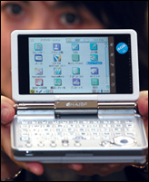 موظفة بشركة شارب الإلكترونية تعرض المنتج الجديد للشركة من المنتجات الشخصية الرقمية (PDA) زيروس (SLC3000 ) وذلك أثناء المؤتمر الصحفي الذي أقيم في مقر الشركة الرئيسي بطوكيو ........
