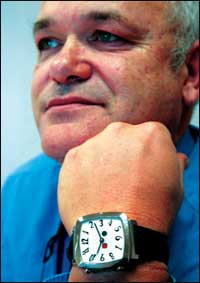 الدكتور تشارلز انتونيه روسي رئيس مؤسسة (نظام الصحة المعلوماتي) (DHS) يستعرض منتج المؤسسة الجديد، وهو عبارة عن ساعة أنيقة مزودة بتقنية جديدة كلياً تتمكن من مراقبة صحة المرضى ........