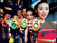 مجموعة من العارضات الكوريات يستعرضن منتج شركة إل جي(LG) الجديد من الهواتف النقالة المضادة للماء. ويتميز هذا المنتج الجديد بقدرته على منع دخول الماء إلى داخل الجهاز ........