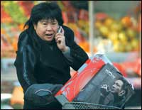 سيدة صينية تتحدث عبر هاتفها النقال في إحدى شوارع العاصمة الصينية بكين. وقد أعلنت الحكومة الصينية مؤخراً عن نيتها تسجيل هويات مستخدمي خطوط الهاتف النقال ........