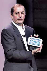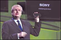 المدير التنفيذي ورئيس مجلس إدارة شركة سوني العالمية السيد هوارد سترينغر أثناء إلقائه خطابه الافتتاحي الذي يستعرض فيه جهاز البلاي ستيشن المحمول(PSP) في أحد المعارض التقنية. ........