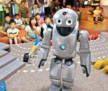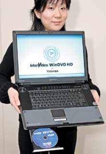 موظفة بشركة هيتاشي العالمية والمتخصصة في الصناعات الإلكترونية تستعرض منتج الشركة الجديد من الكمبيوترات المحمولة والذي يعد أول جهاز محمول يحمل أقراص تشغيل (DVD) وقرص صلب من ........