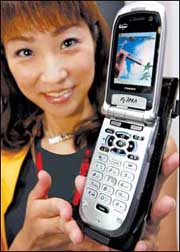 تستعرض موظفة بشركة أن تي تي دوكومو اليابانية للاتصالات نموذجا أوليا لبطاريات الهواتف النقالة والتي تعمل على بطاريات خلايا الوقود أنتجتها شركة فيجتسو، وتتميز البطاريات التي تعمل على خلايا الوقود بقدرتها على الصمود لفترات طويلة، والبطارية التي تظهر في الصورة وهي القطعة السوداء التي تغطي خلفية الجهاز تم عرضها في معرض الإلكترونيات، والذي يعد أكبر المعارض التكنلوجية في قارة آسيا، في الخامس من شهر اكتوبر الحالي.