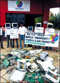 عدد من نشطاء السلام الأخضر يتظاهرون أمام المدخل الرئيس لشركة ويبرو(Wipro) التي تعتبر كبرى الشركات الهندية في مجال التكنولوجيا وإنتاج أجهزة الكمبيوتر، ويأتي التظاهر بسبب عدم ........
