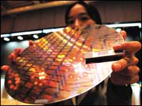 موظفة تابعة لشركة سامسونج الكورية الرائدة في صناعة الأجهزة التكنولوجية تقوم بعرض منتج الشركة الجديد من كروت الذاكرة من نوع (NAND) وتقول الشركة إن هذا الكارت على شكل ........