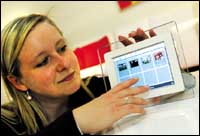 موظفة بشركة فيليبس الألمانية للمنتجات الإلكترونية تعرض إطارا من إنتاج الشركة لعرض الصور الرقمية بشكل البوم الصور العادي، ويمكن لهذا الجهاز الجديد من الشركة تخزين وعرض أكثر ........