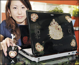 إعداد: أحمد عبد اللطيفطوكيو - اليابانموظفة بشركة ان إي سي اليابانية للحواسيب تعرض جهاز حاسوب دفترياًً جديداً بسعة 120 جيجابايت وشاشة عرض ال سي دي، عليها زخارف ضمن عرض للشركة في طوكيو في 31-10-2007م.