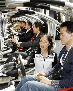شيبا - اليابانزوار معرض طوكيو للسيارات في شيبا، إحدى ضواحي طوكيو، يستمتعون بممارسة لعبة فيديو حول قيادة السيارات.اللعبة أنتجتها شركة سوني وأطلقتها لأول مرة عبر هذا المعرض الذي تستخدم فيه ألعاب الفيديو ضمن برنامج الترويج للسيارات.