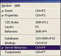 2- إذا لم تكن أي لوحة pacel موجودة نقوم بتنشيطها من قائمة windows وهنا يمكننا اختيار server behavior