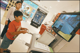 طفل هندي يؤدي ألعابا على الحاسوب في محل للألعاب الحاسوبية في الضاحية الجنوبية لنيودلهي قبل أيام من احتفالات الهند بمناسبة مرور 60 عاما على استقلال الهند عن بريطانيا. وترى الهند نفسها، بسكانها البالغ عددهم أكثر من مليار نسمة، على أعتاب نهضة كبرى تشمل الجوانب السياسية