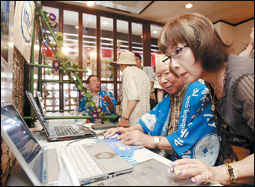مجموعة من كبار السن في اليابان يستمتعون بتصفح الإنترنت في مقهى للإنترنت خاص بكبار السن. المقهى تابع لجمعية لكبار مستخدمي الحاسوب، التي أسست هذا المقهى لإتاحة الفرصة لكبار السن لتلقي الدروس في مجال الحاسوب وتبادل الرسائل والصور والأعمال الإبداعية مثل الرسوم والروايات