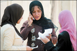 رغم أجواء القصف أنهى طلاب المرحلة الثانوية في العراق الامتحانات النهائية، وفي الصورة طالبات من مدرسة خديجة بنت خويلد الثانوية يتبادلن التهاني عبر الهاتف الجوال بعد ظهور النتائج في الأسبوع الأول من أغسطس.