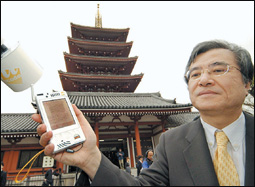 الخبير الياباني كين ساكامور يقف أمام قلعة سنسوجي السياحية بطوكيو عارضا جهاز مساعدة يدوي رقمي مزود بدليل عن الأماكن السياحية لإرشاد السياح الأجانب ضمن مشروع بدأت تنفيذه اليابان بهدف استثمار التقنية في توجيه السياح.