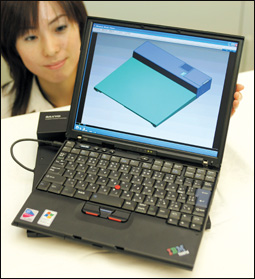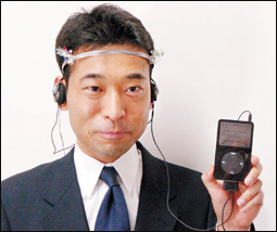 باحث بجامعة أوساكا اليابانية يعرض نموذج لمشغل رقمي موسيقى يعمل بواسطة حركة الأسنان أو عضلات الوجه وقد طورت الجامعة اليابانية تقنية تعمل بالأشعة فوق الحمراء تتيح لأجزاء الوجه ارسال تعليمات لتشغيل المشغلات الصوتية > أ.ف.ب