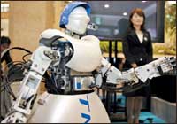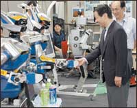 الأمير الملكي الياباني ناروهيتو يصافح أحد الروبورتات من نوع HRP2 Promet خلال زيارته التي قام بها لمختبر جامعة طوكيو بمدينة طوكيو اليابانية العاصمة العالمية للصناعات التقنية ........