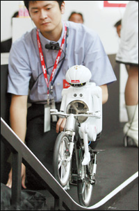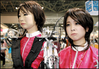 * طوكيو - اليابان:تعبير الحزن باد على وجه اليابانية هيكاري أسانو، طالبة العلوم في جامعة طوكيو، والروبوت بيكارين الذي يشبهها تماماً في الشكل، في معرض للرعاية المنزلية وإعادة التأهيل في طوكيو في الثالث من أكتوبر الجاري. وبإمكان الروبوت بيكارين التعبير عن بعض المشاعر مثل الفرح والحزن والغضب والخوف والدهشة.