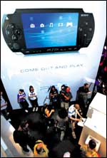 جناح شركة سوني العالمية والرائدة في مجال إنتاج وتصنيع الأجهزة الإلكترونية حيث يشاهد هنا القسم الخاص بجهاز الشركة المحمول والمعروف باسم بلاي ستيشن بورتابل ، حيث تدفق الزوار في صف طويل لتجربة هذا المنتج المطور من الشركة والذي كان قد سبق إطلاقه الشهر الماضي في السوق العالمية .