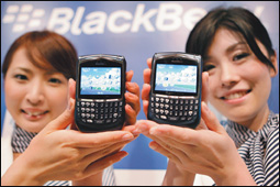 عارضتان تابعتان لشركة (رسيرش إن موشن) الكندية تعرضان الهاتف الذكي (بلاك بيري 8707) خلال مؤتمر صحفي في طوكيو، حيث أطلقت الشركة الجهاز بالتعاون مع شركة الجوالات اليابانية (ن ت ت دوكومو) التي تعمل باللغة اليابانية لخدمة الجمهور المحلي.