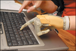 سيدة أمريكية تُدعى ليندسي بلوك ولدت بدون الذراع اليسرى تدخل بيانات على الحاسوب باستخدام ذراع اصطناعية وصفتها الشركة الصانعة بأنها أول ذراع صناعية حيوية أوتوماتيكية ذات مفاصل تسمح بأداء أعمال معقدة مثل إدخال البيانات على لوحة المفاتيح.