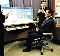 هيو جينتاو رئيس دولة الصين يستمع إلى شرح تفصيلي من أحد موظفي شركة مايكروسوفت في العاصمة الأمريكية واشنطن حيث مقر الشركة الرئيسي.