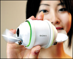 طوكيو، اليابانعارضة يابانية تعرض مشغل الموسيقى (رولي) بذاكرة سعة واحد جيجابايت وميكروفونات مركبة على جسم المشغل ذي الشكل البيضاوي. ومن المتوقع أن يصل هذا الجهاز الذي أنتجته شركة سوني إلى الأسواق بنهاية هذا الشهر.