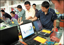 زيان، الصين:زوار معرض للحواسيب في مدينة زيان بشمال الصين يتفحصون أحدث الحواسيب المحمولة. وتقول الإحصائيات إن الولايات المتحدة والصين استقبلتا ثلثي الهجمات الفيروسية للحواسيب للعام 2006م، منها 34.2 بالمائة في الولايات المتحدة و31 بالمائة في الصين.