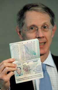 السفير البريطاني لدى الولايات المتحدة الأمريكية ديفيد مانينغ يعرض جواز سفره الجديد للصحفيين في مقر السفارة البريطانية بأمريكا. وهذا الجواز المطور مزوّد ........