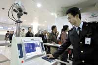 رجل أمن صيني في مطار شنغهاي الدولي يقوم بتفحص الركاب القادمين من خلال جهاز خاص بالمسح الحراري عبر كاميرا رقمية متطورة. ويهدف هذا الإجراء إلى فحص ........