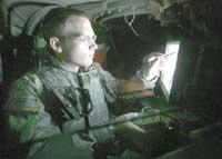 أحد الجنود الأمريكيين في العراق يستعد لمهمة البحث عن القنابل المفخخة على جوانب الطرق والشوارع بمدينة تكريت العراقية. وقد قام الجيش الأمريكي مؤخراً باستخدام أجهزة تكنولوجية ........