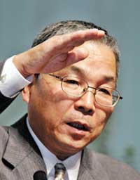 السيد يوكيو ساكاموتو مؤسس ورئيس مجلس إدارة والرئيس التنفيذي لشركة البيدا (Elpida) العالمية في صناعة الشرائح الإلكترونية خلال إدلائه بخطبته الافتتاحية في منتدى تجاري في ........