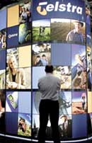 أحد المستثمرين الأستراليين يقف أمام شاشة إعلانية مضيئة لشركة الاتصالات الأسترالية العملاقة (Telstra) إبان الاجتماع السنوي لأعضاء مجلس إدارة الشركة في سيدني.