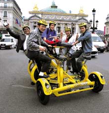 * سياح يمرون بأوبرا باريس على متن الدراجة «فيلوفست». الدراجة الجديدة تشتمل على سبعة مقاعد، مقعد للسائق وستة مقاعد للركاب ويمكن التجول بها ........