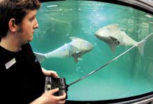 موظف بشركة فيستو الألمانية يعرض كيفية التحكم في أسماك في الهواء بجهاز تحكم عن بعد.