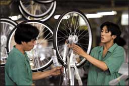 * عمال صينيون يقومون بتجميع دراجات من طراز «الحمامة الطائرة» في مصنع للدراجات بمدينة كيانجين الصينية ويعتبر هذا المصنع من المصانع الرائدة في مجال صناعة الدراجات في الصين وينتج حوالي مليون دراجة سنوياً.........