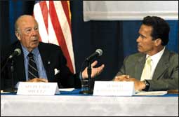 * الممثل الأمريكي أرنولد شوارزنجر المرشح لتولي منصب حاكم ولاية كاليفورنيا ووزير الخارجية الأمريكي الأسبق جورج شولتز خلال لقاء بعنوان (مجلس كاليفورنيا للانتعاش الاقتصادي في مدينة لوس أنجلس).........