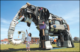 طفلة استرالية تبدي إعجابها بفيل تم صنعه من أجهزة تلفزيون وكمبيوتر قديمة من قبل النحات البريطاني أنطوني هاي وود للمشاركة في معرض النحت السنوي المقام في مدينة سيدني بأستراليا. ويشارك في المعرض 112 فناناً يمثلون 30 دولة. (أ.ف.ب)........