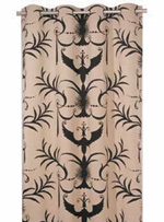 * نموذج من الستائر الخاصة بالحمام تحمي النوافذ، مصنوعة من الخيوط التركيبية التي تغلب على صناعة النايلون، ملونة بألوان البيج والأسود.