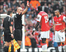 قال الاتحاد الإنجليزي لكرة القدم انه فرض غرامة على ناديي أرسنال وتشيلسي قدرها 100 ألف جنيه استرليني (196100 دولار) ووبخهما بعد مشاجرة جماعية وقعت بين لاعبي الناديين خلال المباراة النهائية لبطولة كأس رابطة الاندية الإنجليزية في كارديف الشهر الماضي. وأصبح أرسنال اول فريق في تاريخ الكرة الإنجليزية يطرد منه لاعبان في مباراة نهاية لبطولة كبرى بعد طرد قائده كولو توري وايمانويل اديبايور في نهائي