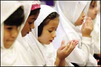 تلميذات أمريكيات مسلمات يؤدين الصلاة داخل إحدى صالات الرياضة بمدرسة ابتدائية في ولاية إلينوي الأمريكية. ويشهد شهر رمضان في الولايات المتحدة إقبالاً كبيراً من المسلمين على التوجه إلى المساجد لأداء الصلاة والتعبد خلال الشهر الكريم.