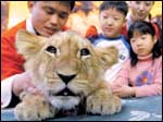 عدد من الأطفال الكوريين الجنوبيين يداعبون شبلاً في قاعة إحدى دور السينما بالعاصمة سيول. وقد تم وضع هذا الشبل للترويج لفيلم يتم عرضه بعنوان «أسود كالاهاري». (أ.ف.ب)........