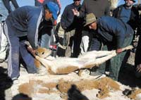 «*الفكونة» حيوان نادر وصوفه عالي القيمة، وفي الصورة مزارعون في البيرو يمسكون بها ويجزون صوفها ضمن احتفال تقليدي.