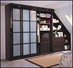 * صممت هذه الخزانة لتناسب الجدار في الصالون مكونة من طوابق متعددة، مزودة بأبواب من الزجاج تتحرك على جسور.