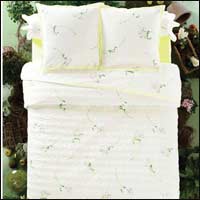 * مفارش من ألوان زاهية تجمع بين الأبيض ولمسات من اللون الأخضر تغطي جميع مفردات السرير.