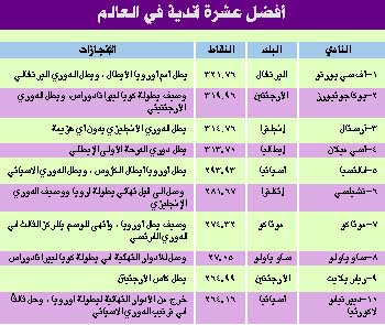 فثبت آرسنال الإنجليزي اقدامه في المركز الثالث ، وحافظ تشيلسي أيضاً على نفس ترتيبه السابق في المركز السادس وخلت قائمة العشر الأوائل من نادي الشياطين الحمر مانشستر يونايتد الذي حل في المركز الرابع عشر. وبالنسبة لإيطاليا فقد حل سي ميلان في المرتبة الرابعة وهو نفس ترتيبه في العام الماضي ولم يشفع له سوى فوزه ببطولة الدوري الإيطالي والتي لولاها لخرج من قائمة العشر الأوائل ، وحل وصيفه في الدوري نادي جوفنتوس في المرتبة الخامسة عشر متقدما بمرتبة واحدة عن العام الماضي عندما حل في المركز السادس عشر. والمفاجأة إذا صح التعبير هي الأندية الأسبانية فقد حل ريال مدريد في الترتيب الثالث عشر وبرشلونة في المرتبة الثامنة عشرة ، بينما حل بطل كأس اوروبا فالنسيا في المرتبة الخامسة ، وخلفه ديبرتيفو دي لا كرونيا في المرتبة العاشرة.