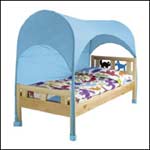 * سرير نوم خاص لغرفة الطفل مزود بمظلة تنسجم ألوانها مع ألوان المفرش حيث الأزرق والبنفسجي